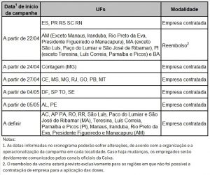 O início da campanha ocorre de forma gradual, com aplicação por empresas contratadas em diversas regiões a partir de 22 de abril, incluindo estados como Espírito Santo, Paraná, Rio Grande do Sul, Santa Catarina e Rio Grande do Norte. Outras localidades seguem cronograma específico ao longo das semanas seguintes, com previsão de expansão até maio.